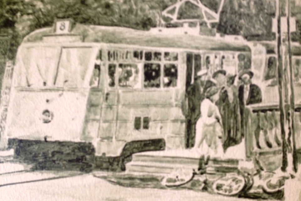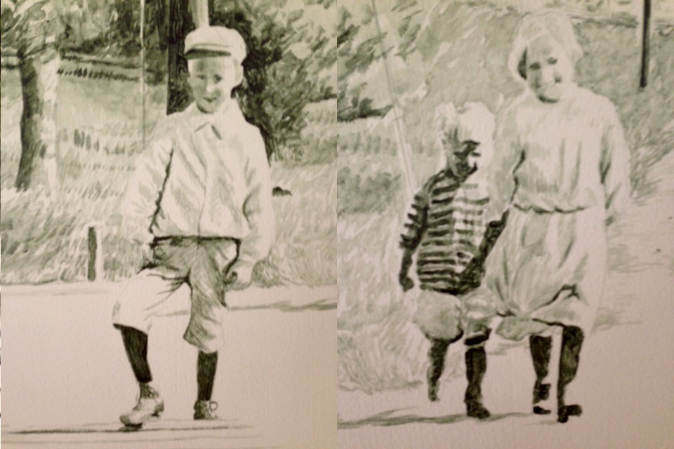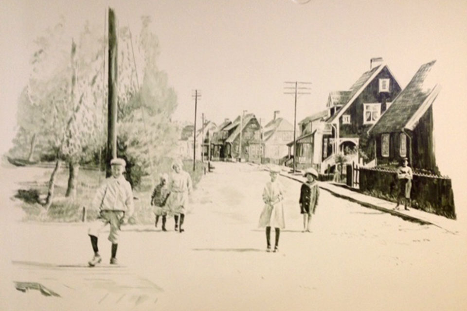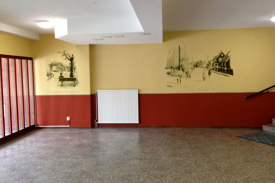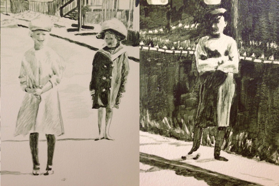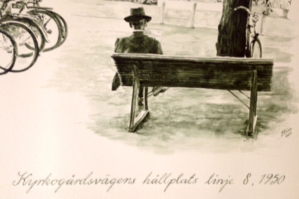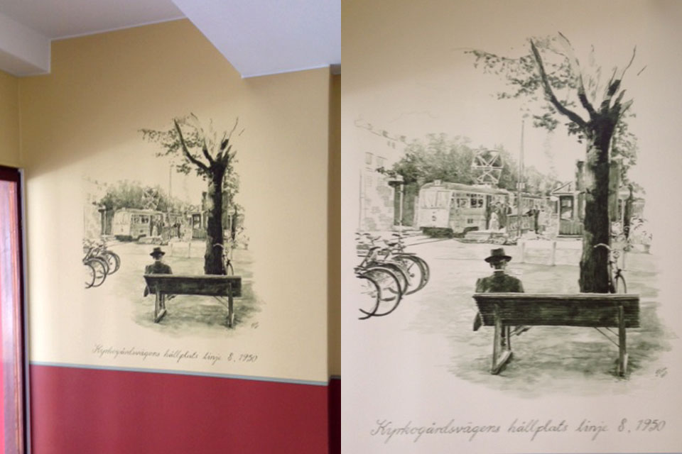 Här är två väggmålningar från Skolgatan i Enskede. Förlagan är två gamla foton tagna i kvarteren för ca 100 år sedan. Texten under bilderna beskriver platsen och årtal.